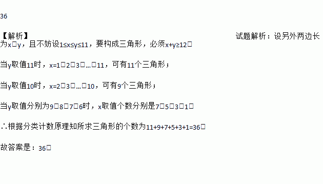 36 【解析】试题解析:设另外两边长为x,y,且不妨设1≤x≤y≤11,要构成三角形,必须x+y≥12. 当y取值11时,x=1,2,3,…,11,可有11个三角形; 当y取值10时,x=2,3,…,10,可有9个三角形; 当y取值分别为9,8,7,6时,x取值个数分别是7,5,3,1, ∴根据分类计数原理知所求三角形的个数为11+9+7+5+3+1=36. 故...