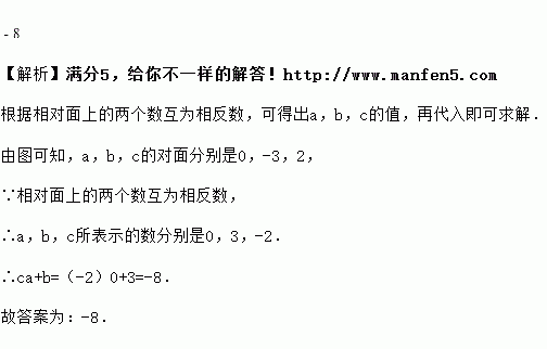 如图,用一个正方体纸盒的展开图,按虚线折成正方体后,相对面上的两个数互为相反数,则________.