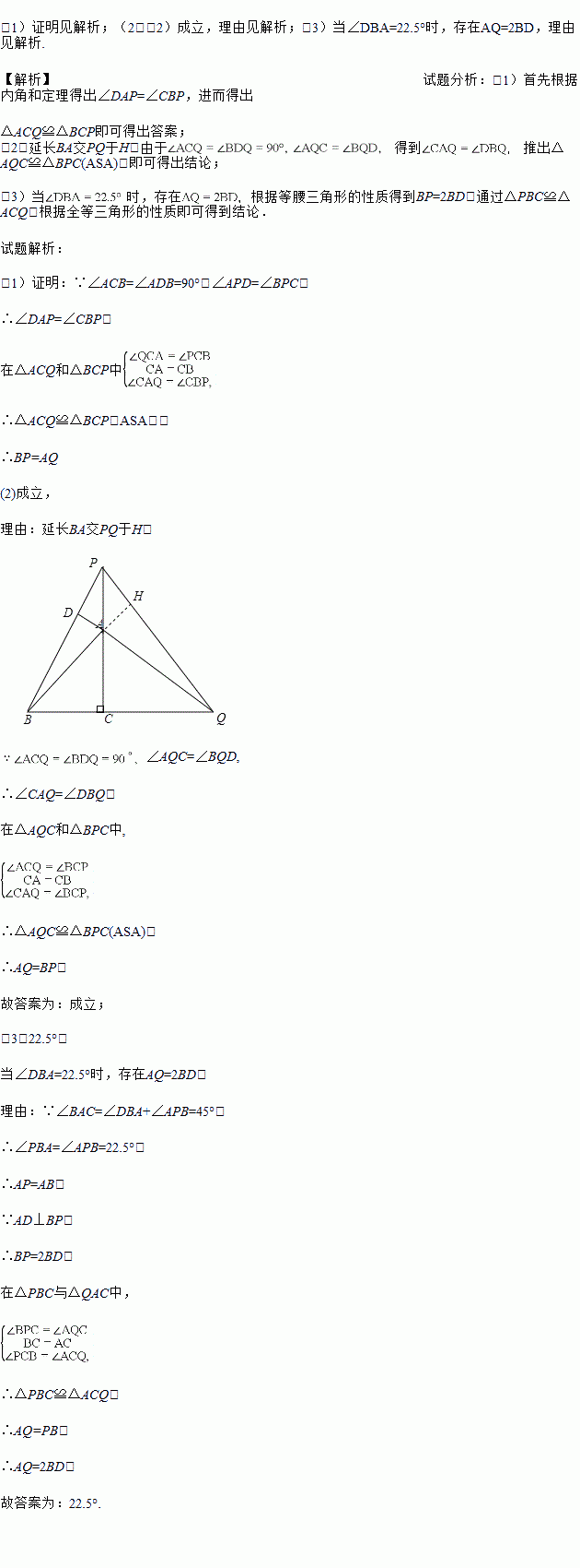 (1)证明见解析;(2)(2)成立,理由见解析;(3)当∠DBA=22.5°时,存在AQ=2BD,理由见解析. 【解析】试题分析:(1)首先根据内角和定理得出∠DAP=∠CBP,进而得出 △ACQ≌△BCP即可得出答案; (2)延长BA交PQ于H,由于 得到 推出△AQC≌△BPC(ASA),即可得出结论; (3)当时,存在根据等腰三角形的性质得到BP=2BD,通过△PBC≌△AC...