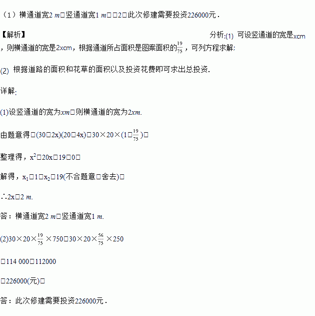 (2)若修建1 m2道路需投资750元,种植1 m2花草需投资250元,此次修建需投资多少钱?