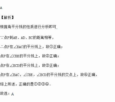 如图,点P到AE,AD,BC的距离相等,则下列说法:①点P在∠BAC的平分线上;②点P在∠CBE的平分线上;③点P在∠BCD的平分线上;④点P是∠BAC,∠CBE,∠BCD的平分线的交点.其中,正确的是( )