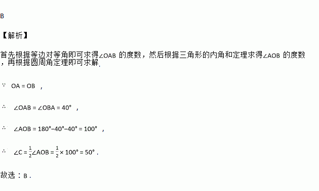 如图,AB是⊙O的弦,点C在圆上,已知∠OBA=40°,则∠C=( )