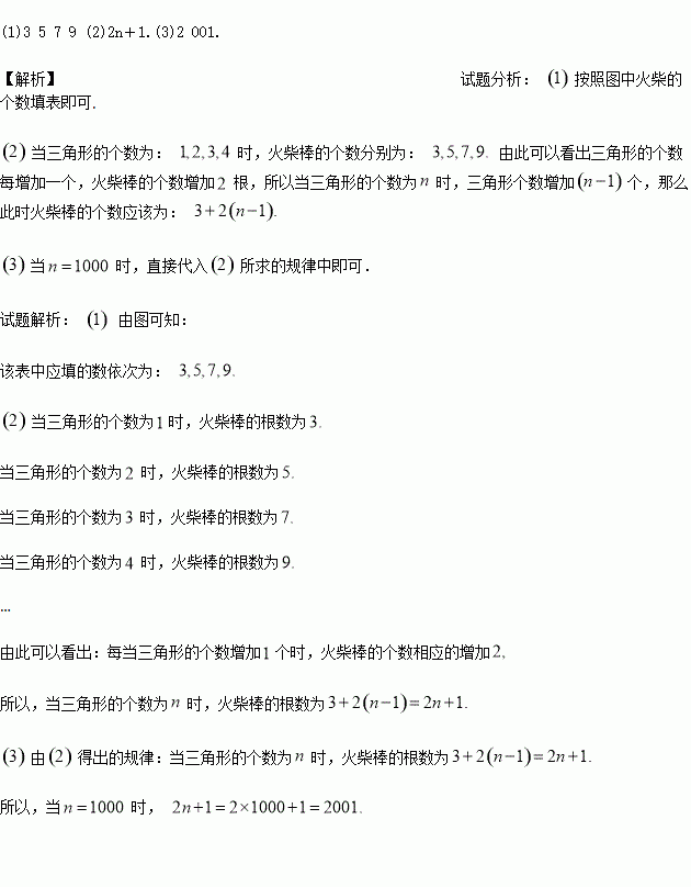 (3)求当n=1 000时,火柴棒的根数是多少.