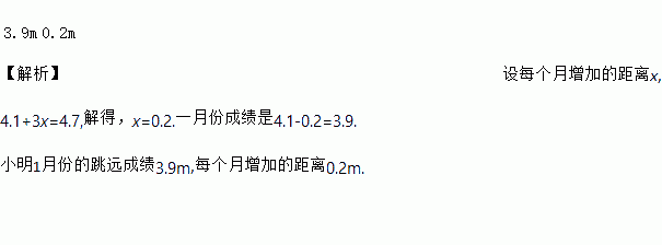 小明从今年1月初起刻苦练习跳远,每个月的跳远成绩都比上一个月有所增加,而且增加的距离相同,2月份、5月份他的跳远成绩分别是4.1 m,4.7 m,请你算出小明1月份的跳远成绩________,每个月增加的距离_______.