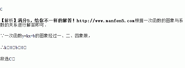 A. k>0,b>0 B. k>0,b<0 C. k<0,b>0 D. k<0,b<0