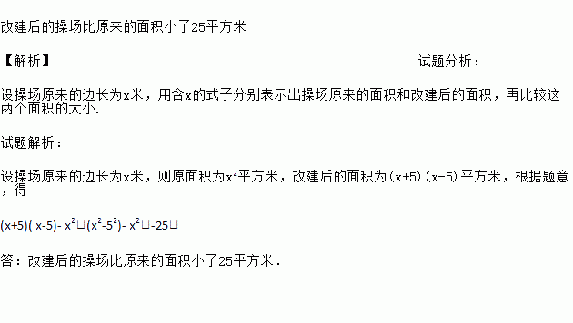 某农村中学进行校园改造建设,他们的操场原来是正方形,改建后变为长方形,长方形的长比原来的边长多5米,宽比原来的边长少5米,那么操场的面积是比原来大了,还是比原来小了呢?相差多少平方米?
