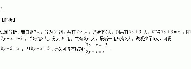 某班有x人,分y组活动,若每组7人,则余下3人;若每组8人,则最后一组只有3人。求全班人数,下列方程组中正确的是( )