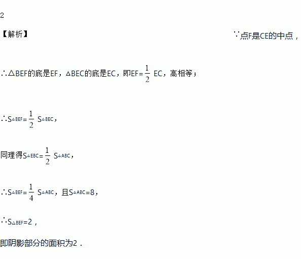 如图,在△ABC中,已知点D为BC边上一点,E、F分别为边AD、CE的中点,且S△ABC=8cm2,则S阴影=___cm2.