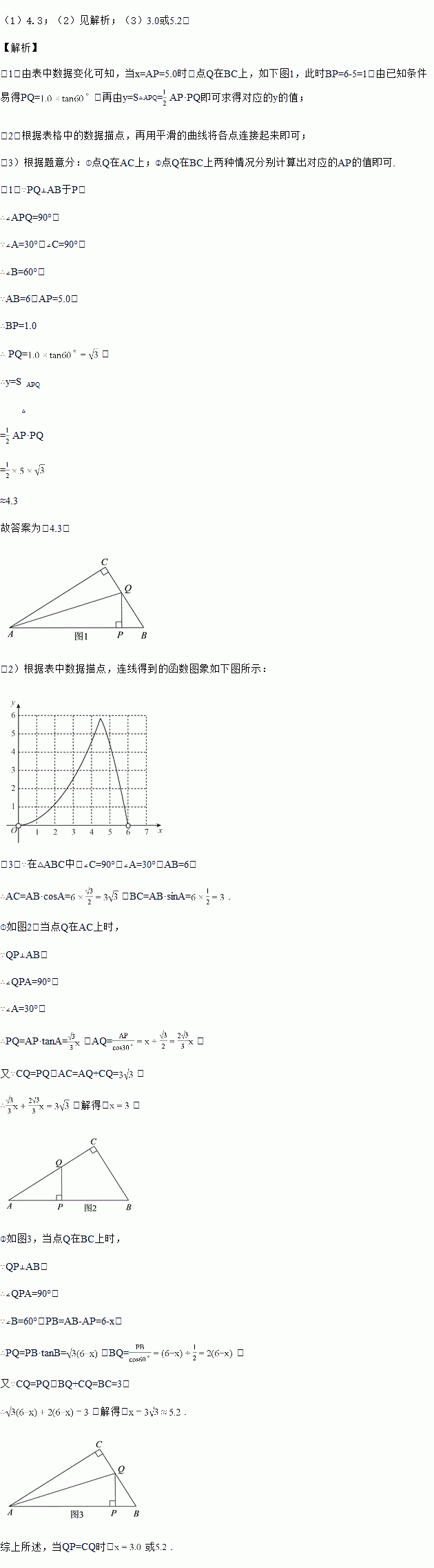 如图,△ABC中,∠ACB=90°,∠A=30°,AB=6,点P是斜边AB上一点(点P不与点A,B重合),过点P作PQ⊥AB于P,交边AC(或边CB)于点Q,设AP=x,△APQ的面积为y.