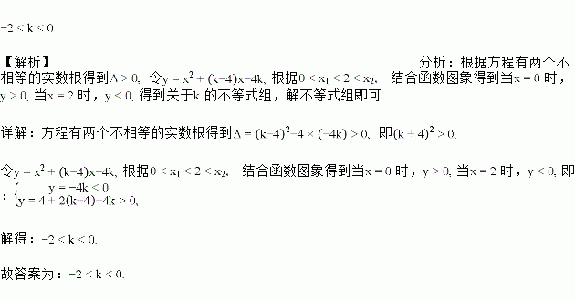 设关于x的方程x2 +(k-4)x-4k =0 有两个不相等的实数根x1,x2,且0<x1<2<x2,那么k的取值范围是 __________.