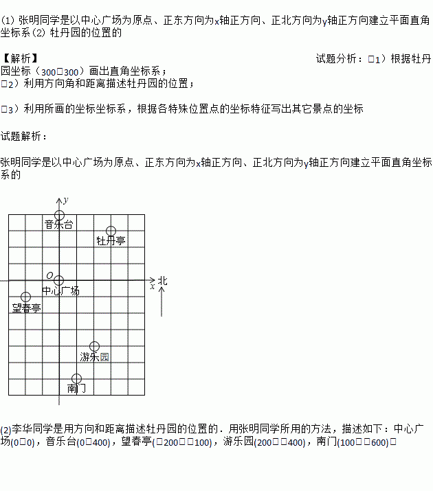 (2)李华同学是用什么来描述牡丹园的位置的?请用张明同学所用的方法,描述出公园内其他地方的位置.