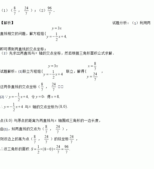(1)(, );(2). 【解析】试题分析:(1)利用两直线相交的问题,解方程组 即可得到两直线的交点坐标; (2)先求出两直线与轴的交点坐标,然后根据三角形面积公式求解. 试题解析:(1)联立方程组联立,解得, 这两条直线的交点坐标(, ); (2) 令 得 与轴的交点坐标为 点与原点的距离为两直线与轴围成三角形的一边长度, 由(1),知两直线的交点为(, ),...