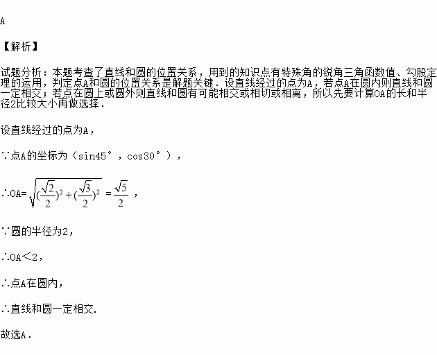 在平面直角坐标系xOy中,经过点(sin45°,cos30°)的直线,与以原点为圆心,2为半径的圆的位置关系是( )