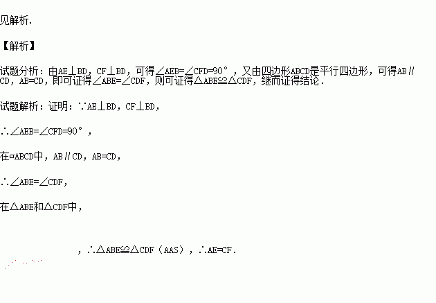 如图,E,F为平行四边形ABCD的对角线BD上的两点,AE⊥BD于点E,CF⊥BD于点F.