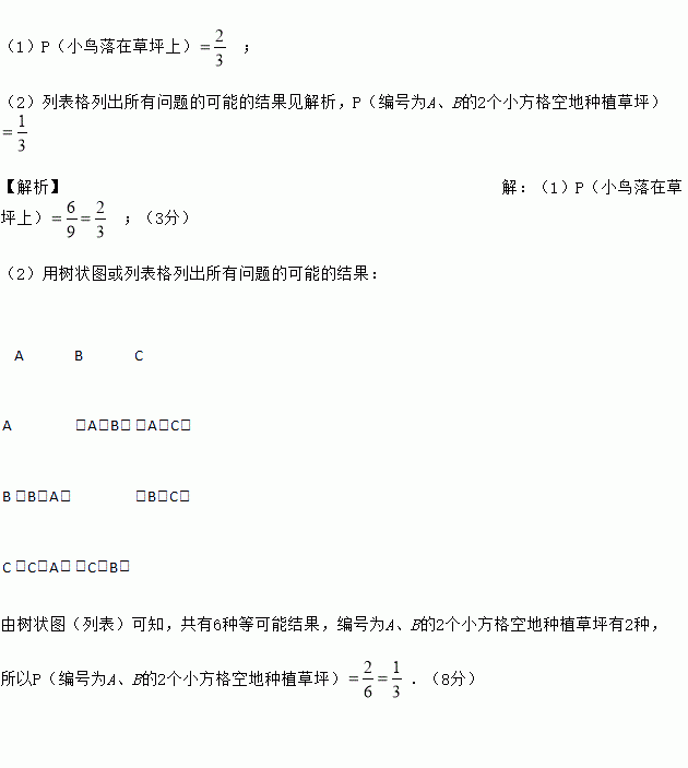 (1)P(小鸟落在草坪上) ; (2)列表格列出所有问题的可能的结果见解析,P(编号为A、B的2个小方格空地种植草坪) 【解析】【解析】 (1)P(小鸟落在草坪上) ;(3分) (2)用树状图或列表格列出所有问题的可能的结果: A B C A (A,B) (A,C) B (B,A) (B,C) ...