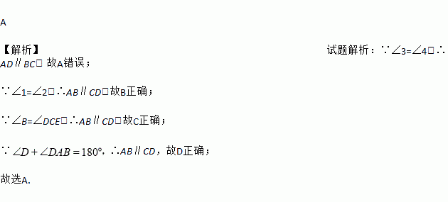 A. ∠3=∠4 B. ∠1=∠2 C. ∠B=∠DCE D. ∠D+∠DAB=180°