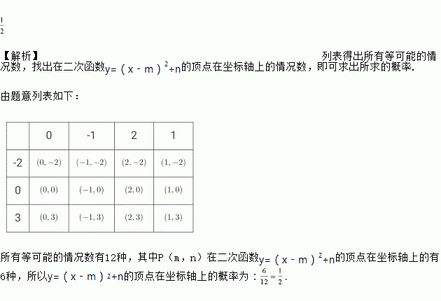 如果m是从﹣1,0,1,2四个数中任取的一个数,n是从﹣2,0,3三个数中任取的一个数,则二次函数y=(x﹣m)2+n的顶点在坐标轴上的概率为________.