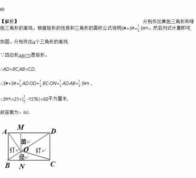 如图,一个矩形分成4个不同的三角形,绿色三角形面积占矩形面积的15%,黄色三角形面积是21平方厘米,则矩形面积为___________平方厘米.