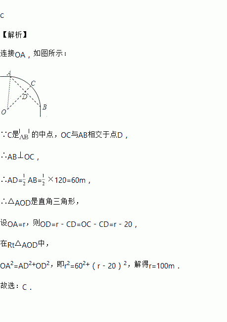 一条公路弯道处是一段圆弧弧AB,点O是这条弧所在圆的圆心,点C是弧AB的中点,OC与AB相交于点D.已知AB=120m,CD=20m,那么这段弯道的半径为( )