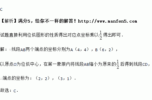 如图,线段AB两个端点的坐标分别为A(4,4),B(6,2),以原点O为位似中心,在第一象限内将线段AB缩小为原来的