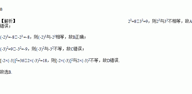 A. 32与23 B. -23与(-2)3 C. -32与(-3)2 D. [-2×(-3)]2与2×(-3)2