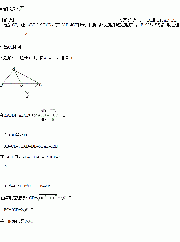 如图所示,在△ABC中,AB=5,AC=13,BC边上的中线AD=6,求BC的长.