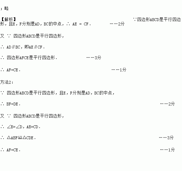 已知:如图,E,F分别是ABCD的边AD,BC的中点.求证:AF=CE.