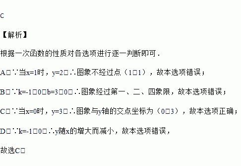 C. 它的图象与y轴的交点坐标为(0,3) D. y随x的增大而增大