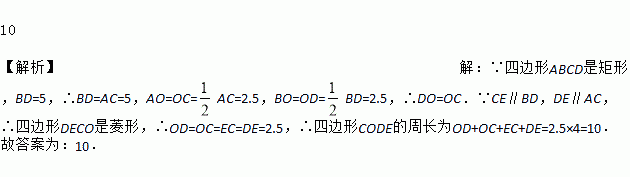 如图,矩形 ABCD 的对角线 AC、BD 相交于点 O,DE ∥ AC,CE ∥ BD,若 BD = 5,则 四边形 DOCE 的周长为______.
