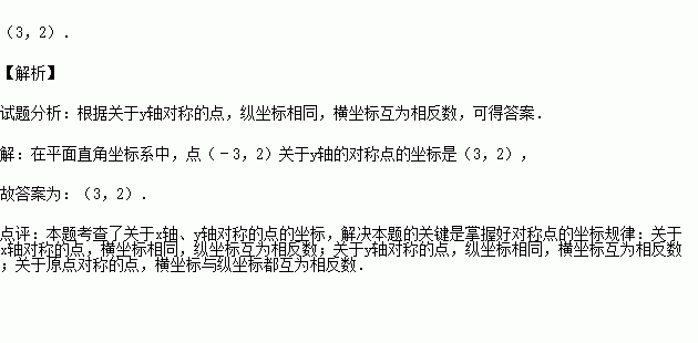 在平面直角坐标系中,点(﹣3,2)关于y轴的对称点的坐标是 .