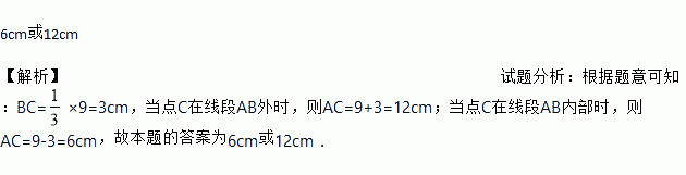 已知A、B、C是直线l上的三点,且线段AB=9cm,BC=AB,那么A、C两点的距离是____________.