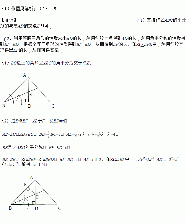 (1)用直尺和圆规作△ABC的边BC上的高AD,并在线段AD上找一点E,使E到AB的距离等于ED(不写作法,保留作图痕迹);