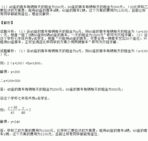 (1)两同学向公司经理了解租车的价格,公司经理对他们说:“公司有45座和60座两种型号的客车可供租用,60座的客车每辆每天的租金比45座的贵100元.”王老师说:“我们学校八年级昨天在这个公司租了5辆45座和2辆60座的客车,一天的租金为1600元,你们能知道45座和60座的客车每辆每天的租金各是多少元吗”甲、乙两同学想了一下,都说知道了价格.
