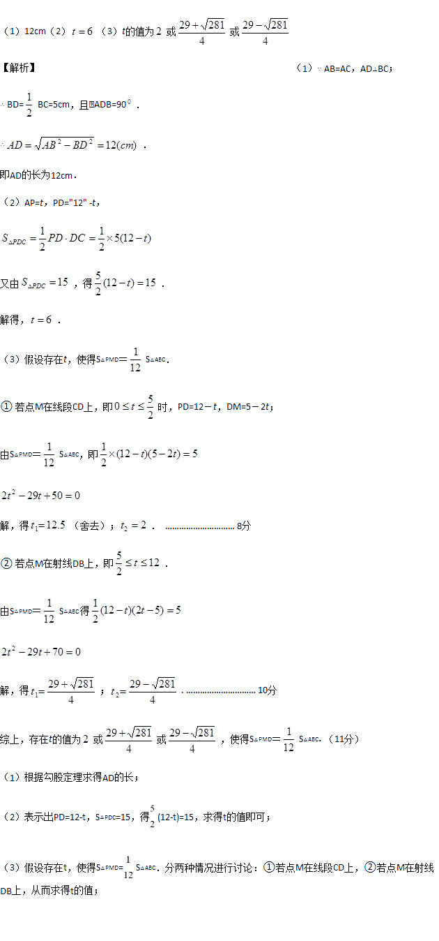 如图,在△ABC中,AB=AC=13厘米,BC=10厘米,AD⊥BC于点D,动点P从点A出发以每秒1厘米的速度在线段AD上向终点D运动,设动点运动时间为t秒.