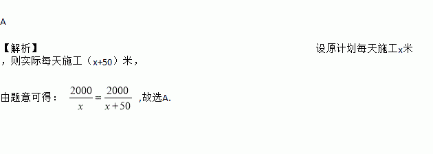 施工队要铺设一段全长2000米的管道,因在中考期间需停工两天,实际每天施工需比原计划多50米,才能按时完成任务,求原计划每天施工多少米.设原计划每天施工x米,则根据题意所列方程正确的是( )