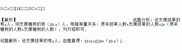 31+x=2[18+(20-x)]. 【解析】试题分析:设支援拔草的有x人,则支援植树的有(20-x)人,根据等量关系:原来拔草人数+支援拔草的人数=2×(原来植树的人数+支援植树的人数),列方程即可. 试题解析:设支援拔草的有x人,由题意得:31+x=2[18+(20-x)].