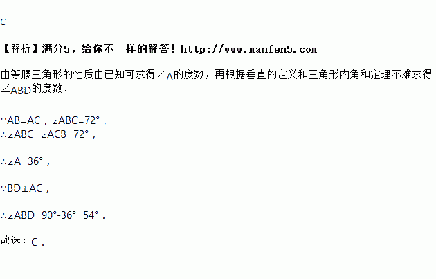 如图,在等腰△ABC中,AB=AC,BD⊥AC,∠ABC=72°,则∠ABD等于( )