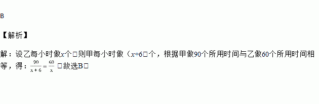 甲、乙二人做某种机械零件,已知甲每小时比乙多做6个,甲做90个所用时间与乙做60个所用的时间相等,求甲、乙每小时各做零件多少个.设乙每小时做x个,列方程为( )
