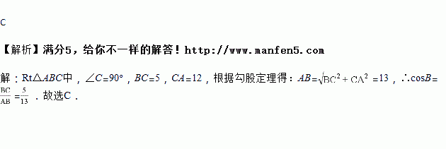 在Rt△ABC中,∠C=90°,BC=5,CA=12,则cosB=( )