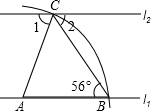分析:首先由题意可得:AB=AC,根据等边对等角的性质,即可求得∠ACB的度数,又由直线l1∥l2,根据两直线平行,内错角相等,即可求得∠2的度数,然后根据平角的定义,即可求得∠1的度数.