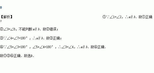 ①∠1=∠2; ②∠3=∠6; ③∠4+∠7=180°; ④∠5+∠3=180°,