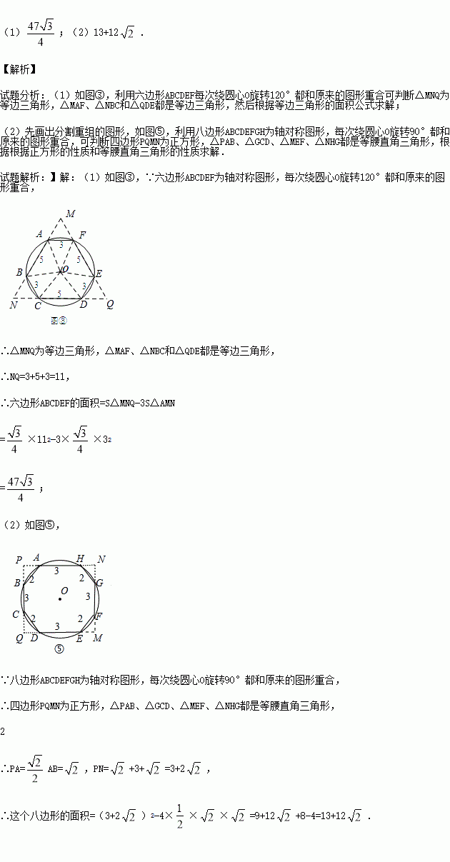 (2)类比探究:一个圆内接八边形,各边长度依次为2,2,2,2,3,3,3,3.求这个八边形的面积.