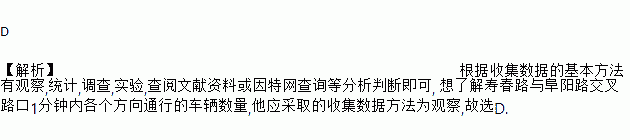 D 【解析】根据收集数据的基本方法有观察,统计,调查,实验,查阅文献资料或因特网查询等分析判断即可, 想了解寿春路与阜阳路交叉路口1分钟内各个方向通行的车辆数量,他应采取的收集数据方法为观察,故选D.