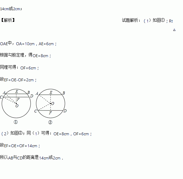 ⊙O的半径为10cm,弦AB//CD,AB = 12cm,CD = 16cm,则AB与CD的距离为_________