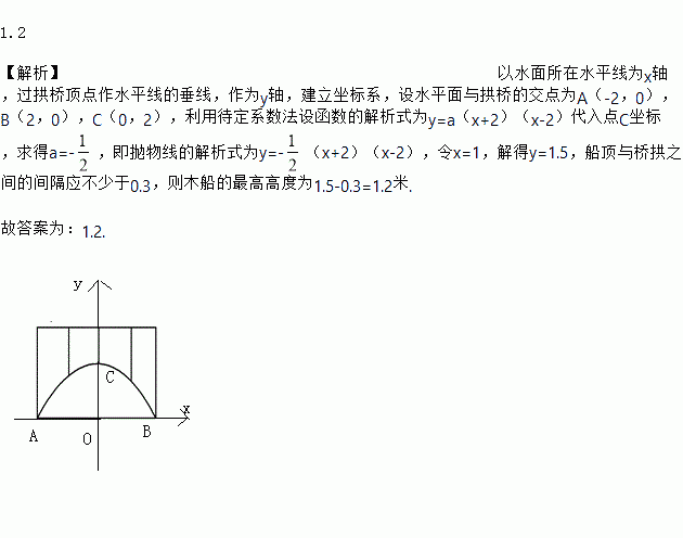 如图,一座抛物线型拱桥,桥下水面宽度是4m时,拱高为2m,一艘木船宽2m.要能顺利从桥下通过,船顶点与桥拱之间的间隔应不少于0.3m,那么木船的高不得超过 ______m.