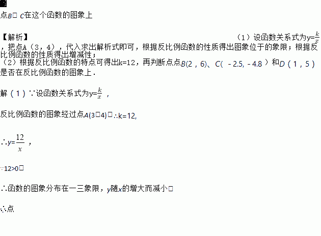 已知反比例函数的图象经过点A(3,4)。