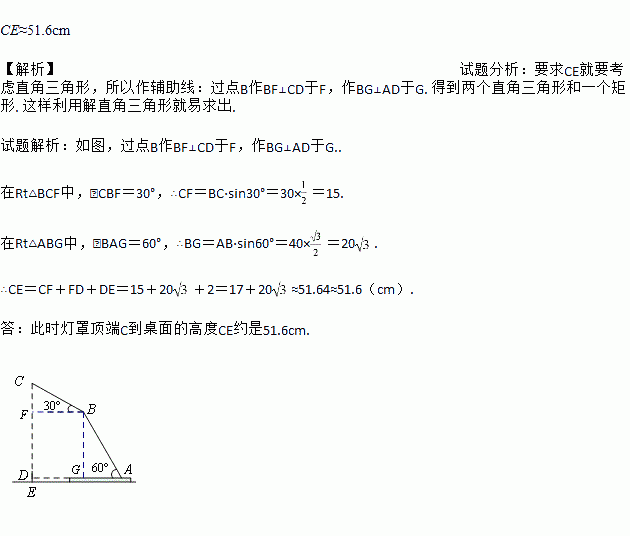 放置在水平桌面上的台灯的灯臂AB长为40 cm,灯罩BC长为30 cm,底座厚度为2 cm,灯臂与底座构成的∠BAD=60°.使用发现,光线最佳时灯罩BC与水平线所成的角为30°,此时灯罩顶端C到桌面的高度CE是多少厘米?(结果精确到0.1 cm,参考数据:
