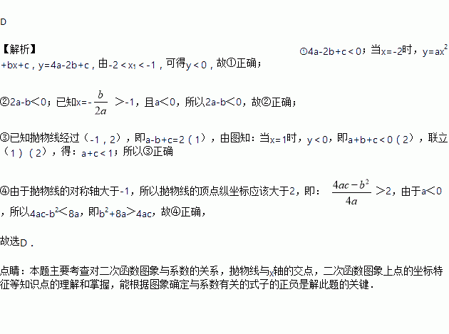 如图,二次函数y=ax2+bx+c(a≠0)的图象经过点(﹣1,2),且与X轴交点的横坐标分别为x1,x2,其中﹣2<x1<﹣1,0<x2<1,下列结论:①4a﹣2b+c<0;②2a﹣b<0;③a+c<1;④b2+8a>4ac.其中正确的有( )