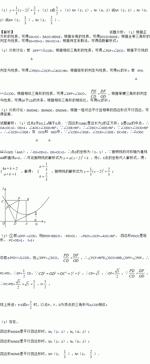 边长为2的正方形OABC在平面直角坐标系中的位置如图所示,点D是边OA的中点,连接CD,点E在第一象限,且DE⊥DC,DE=DC.以直线AB为对称轴的抛物线过C,E两点.