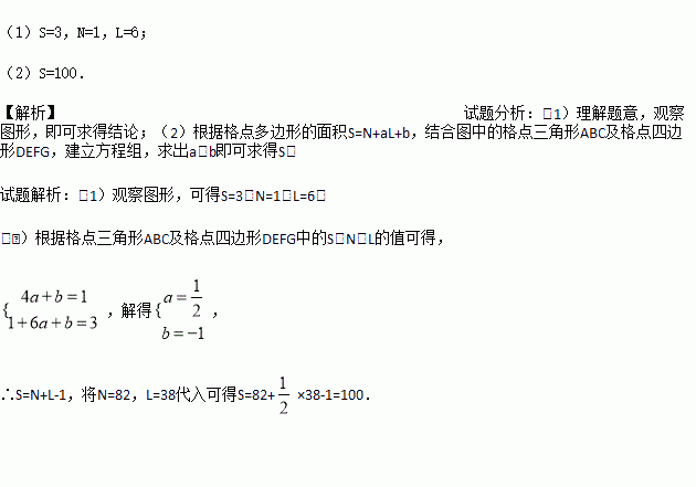 (2)已知格点多边形的面积可表示为S=N+aL+b,其中a,b为常数,若某格点多边形对应的N=82,L=38,求S的值.
